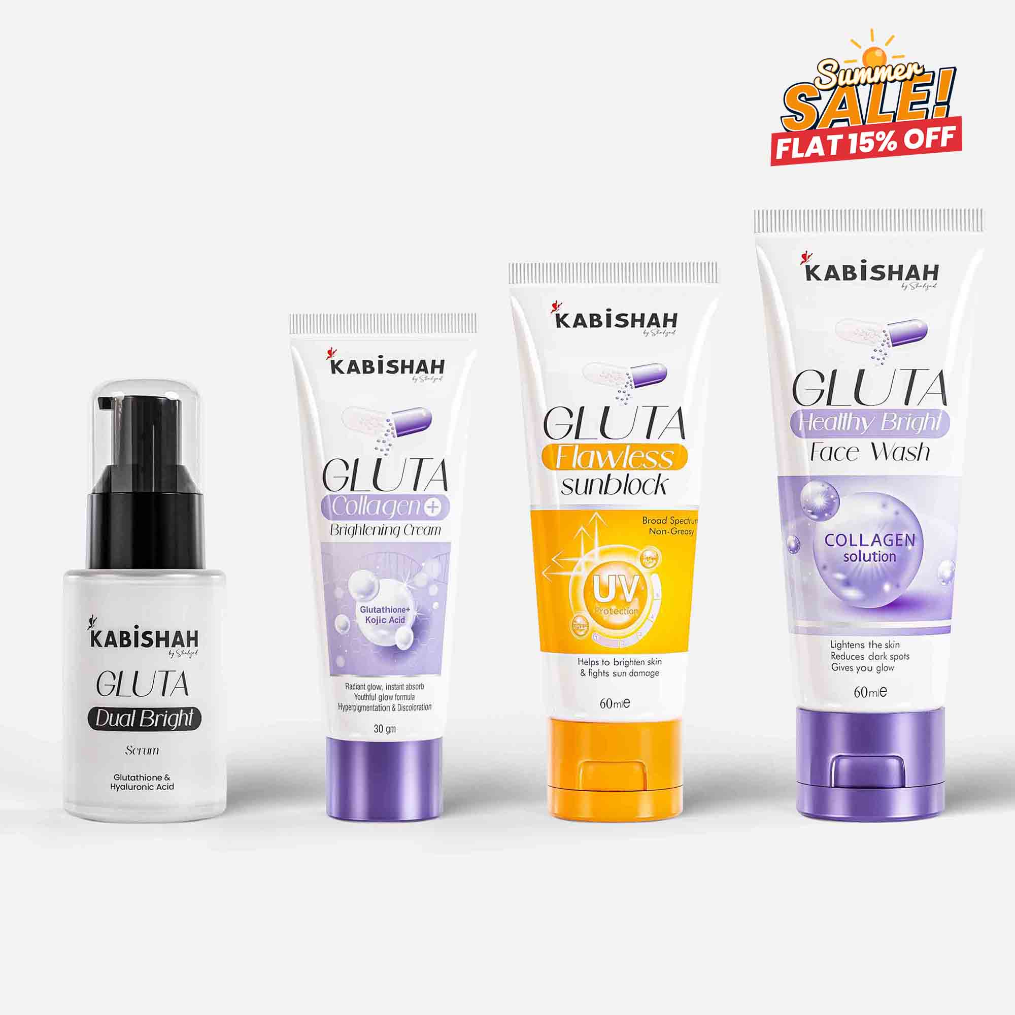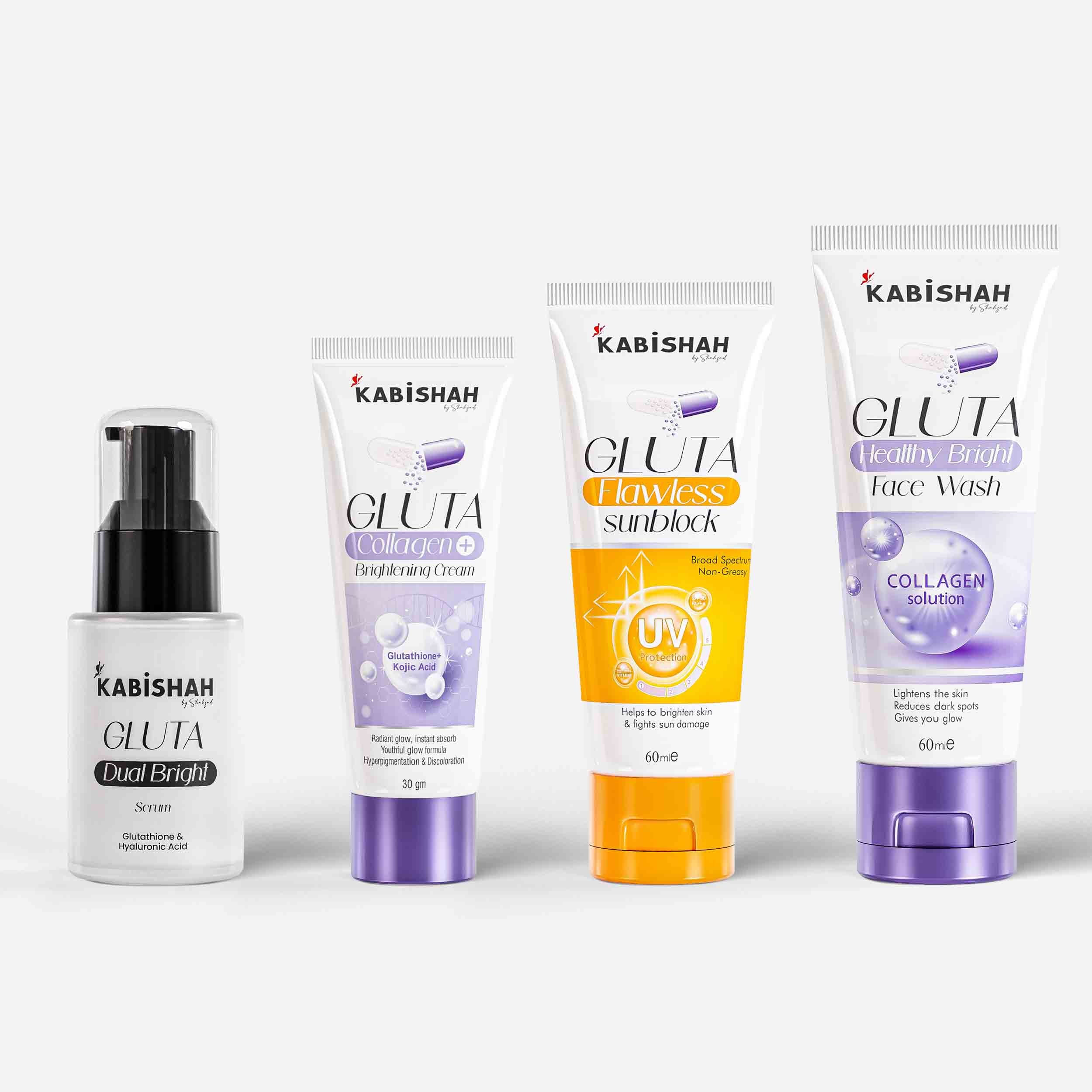 Discover radiant, healthy skin with the Kabishah Gluta Skincare Range, a complete 4-step routine designed to cleanse, brighten, hydrate, and protect. Enriched with Glutathione, Collagen, Kojic Acid, Vitamin C & E, this advanced range targets dark spots, pigmentation, dullness, and uneven skin tone while boosting elasticity and hydration. From the refreshing face wash to the powerful serum, nourishing cream, and protective sunblock, each product works in harmony to give you a youthful, glowing, and even complexion—day after day.