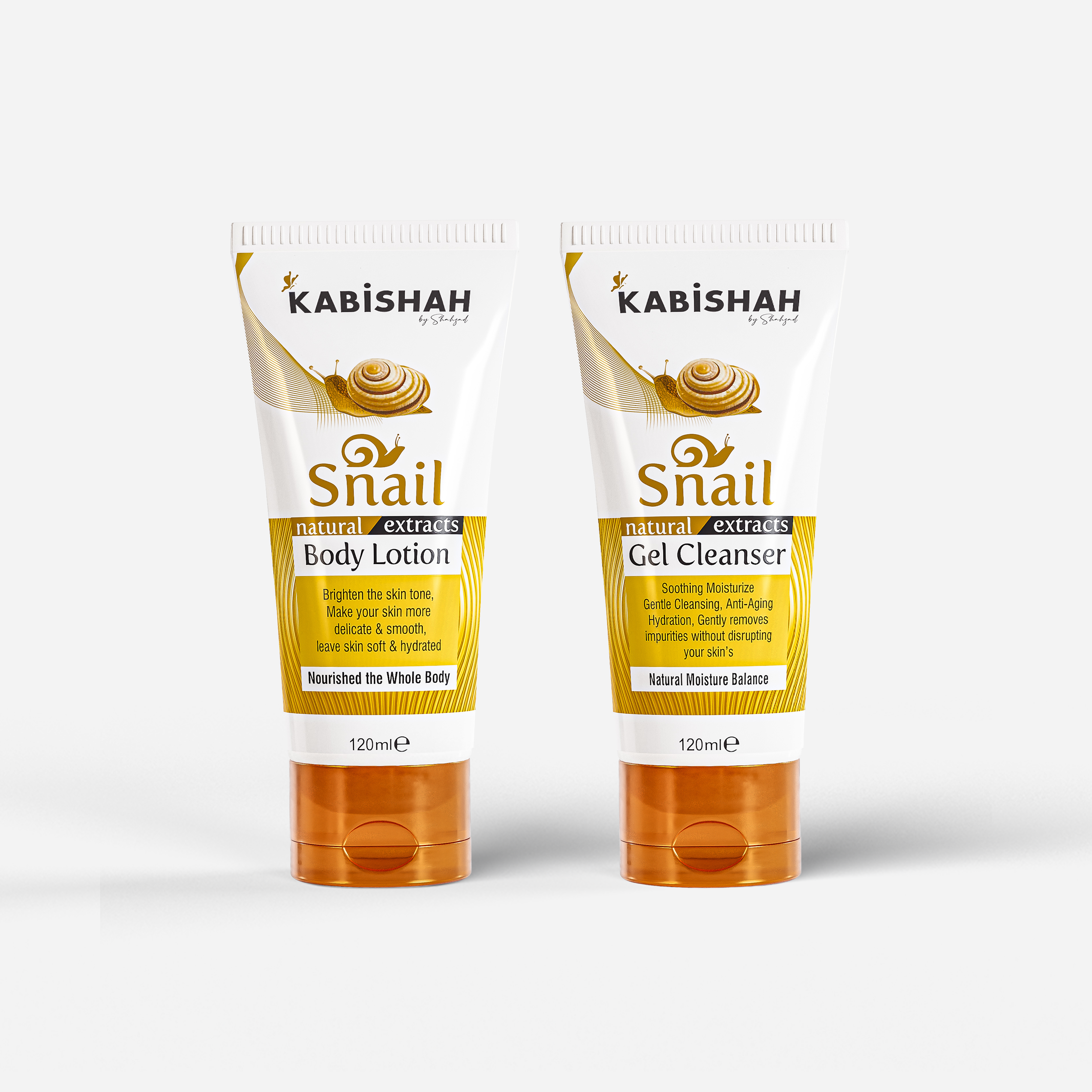 Pamper your skin with Kabishah Snail Natural Extract Body Lotion and Gel cleanser. a deeply hydrating and repairing formula enriched with Snail Mucin, Shea Butter, and Vitamin E. This lightweight yet nourishing formula works to restore skin elasticity, lock in long-lasting moisture, and improve skin texture. It helps fade marks, dryness, and rough patches while leaving your skin soft, smooth, and radiant. With daily use, your skin feels replenished, silky, and healthy all day long.